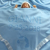 This design features a sleepy but cute unicorn and two lines of custom text. The writing will be in all capital letters, and it’s the perfect font for a baby blanket. In the two lines of text, the most common customization people include is the baby’s name, but you can also add their birth date or any other custom text.