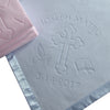 This blanket comes in either pink or blue, and you can include two lines of custom text. Make this blanket entirely theirs by adding the baby’s name to the design. Please don’t be shy; include their middle name too! If you really want to customize it, use the second line of text to include the name of your church. The custom text looks beautiful placed above the cross, dove, and book design.